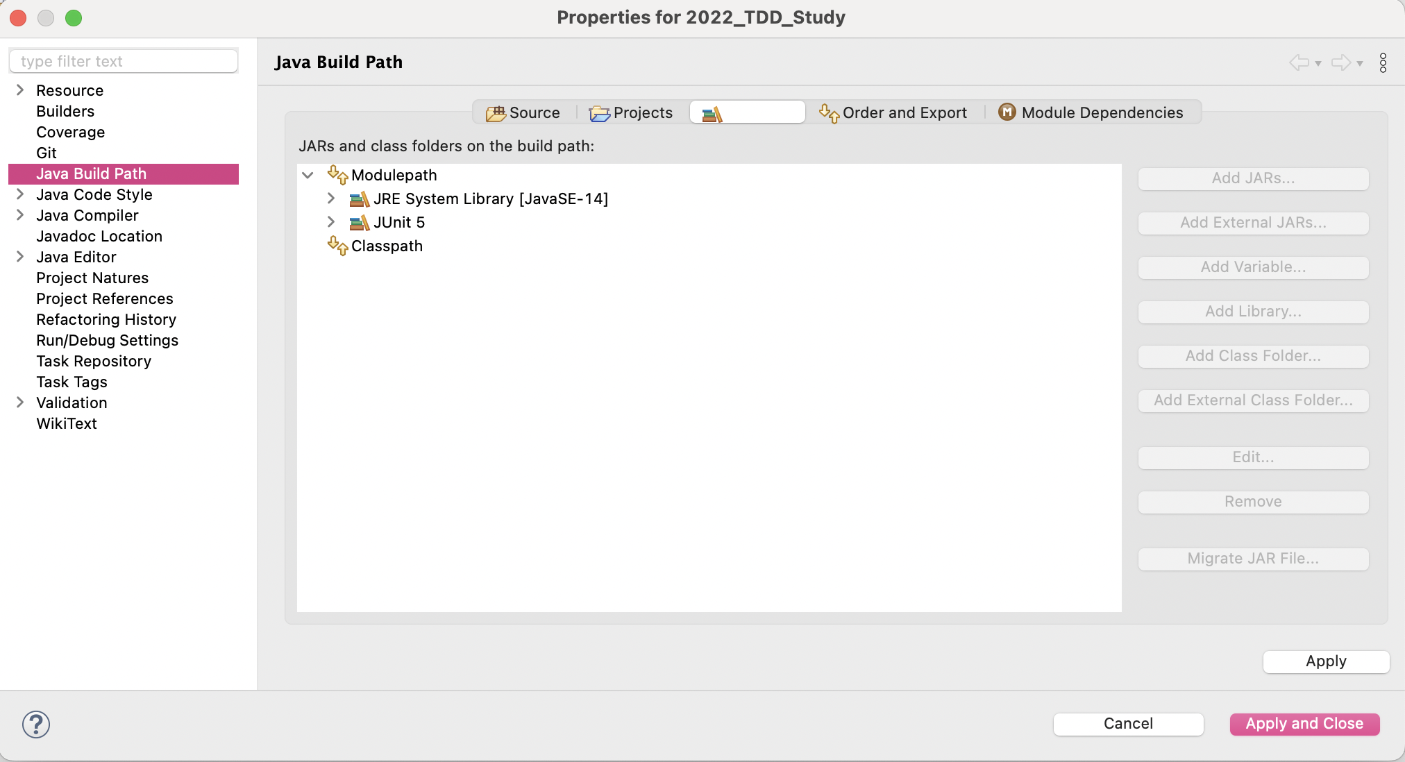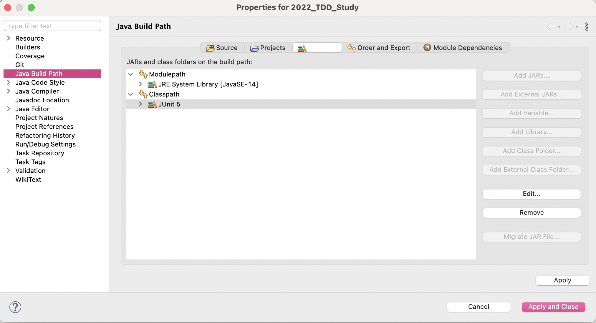 Modulepath에 들어 있는 JUnit5를 아래 'Classpath'로 이동!