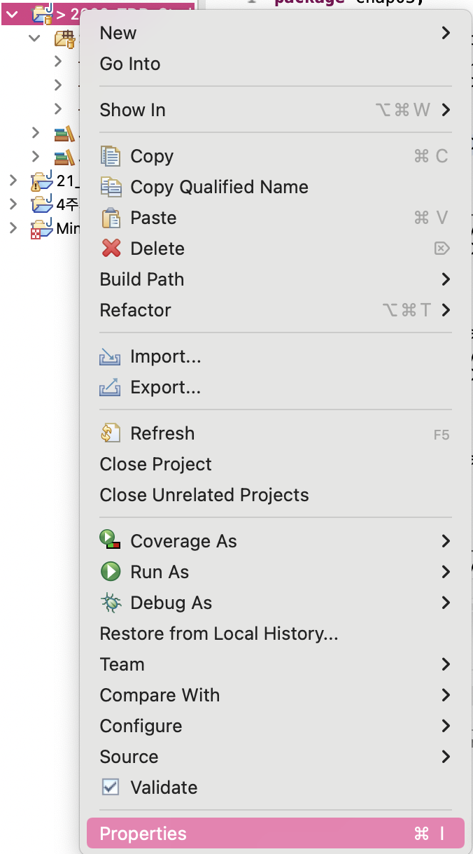 '프로젝트 -> properties -> Java build Path' 로 이동