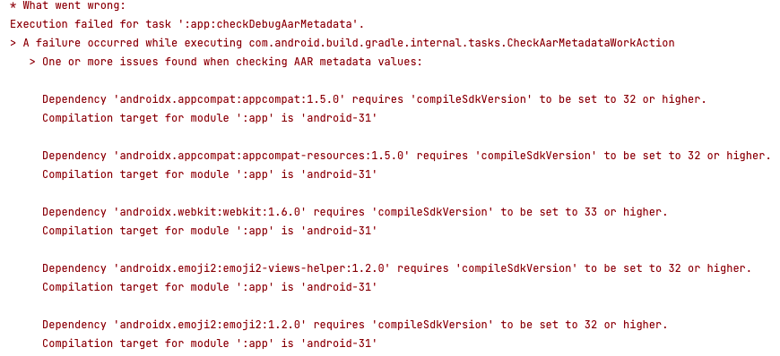 minSdk 뿐만 아니라 targetSdk, complieSdk까지 가장 최신인 33으로 맞춰주고 나서야 해당 에러가 해결됐다.