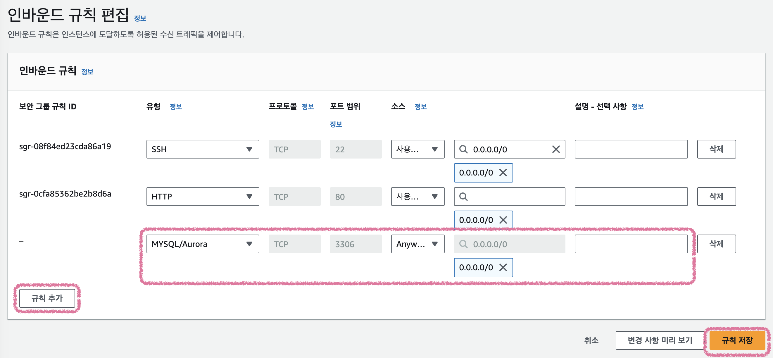 MySQL을 사용하려면 기존에 EC2에 설정한 보안그룹에